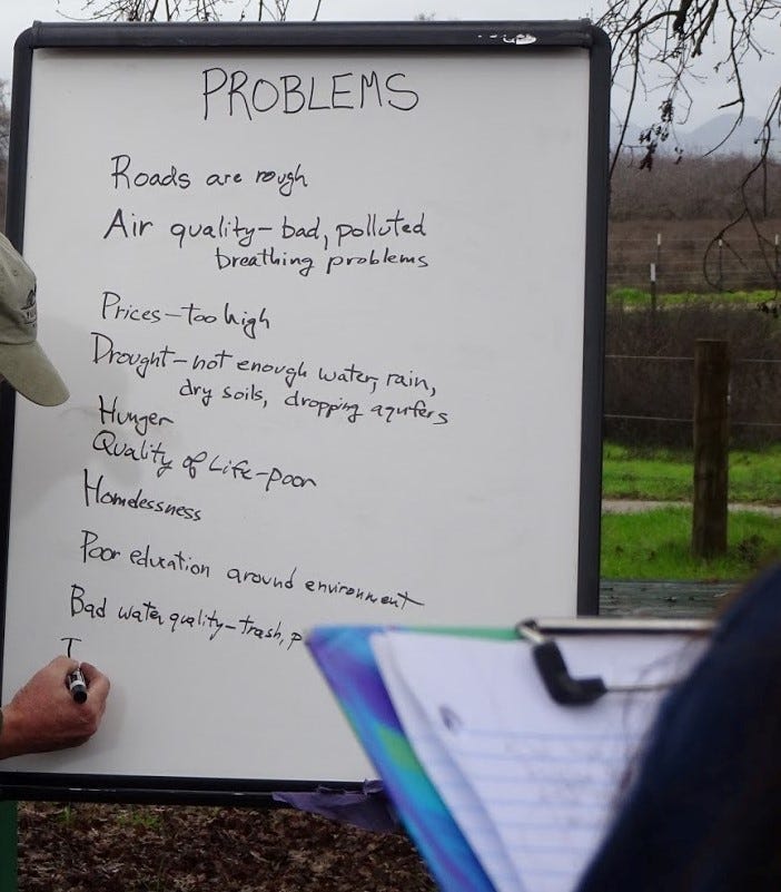 I teach an annual workshop on whole systems landscape function in the Central Valley to a group of mostly Latino/Latina/Latinx high school students and their teachers, along with local conservation groups. I ask them to list the problems in the region, then I divide the students and adults up into about eight groups, and assign each of them to a bureaucratic “department.” The job of each department is to come up with a work plan and a budget for solving one of the identified problems. Each department then has to argue the case for their budget to the group. The arguments quickly become heated. Which is more important: air or water? Which is more of a threat: fire or poverty?